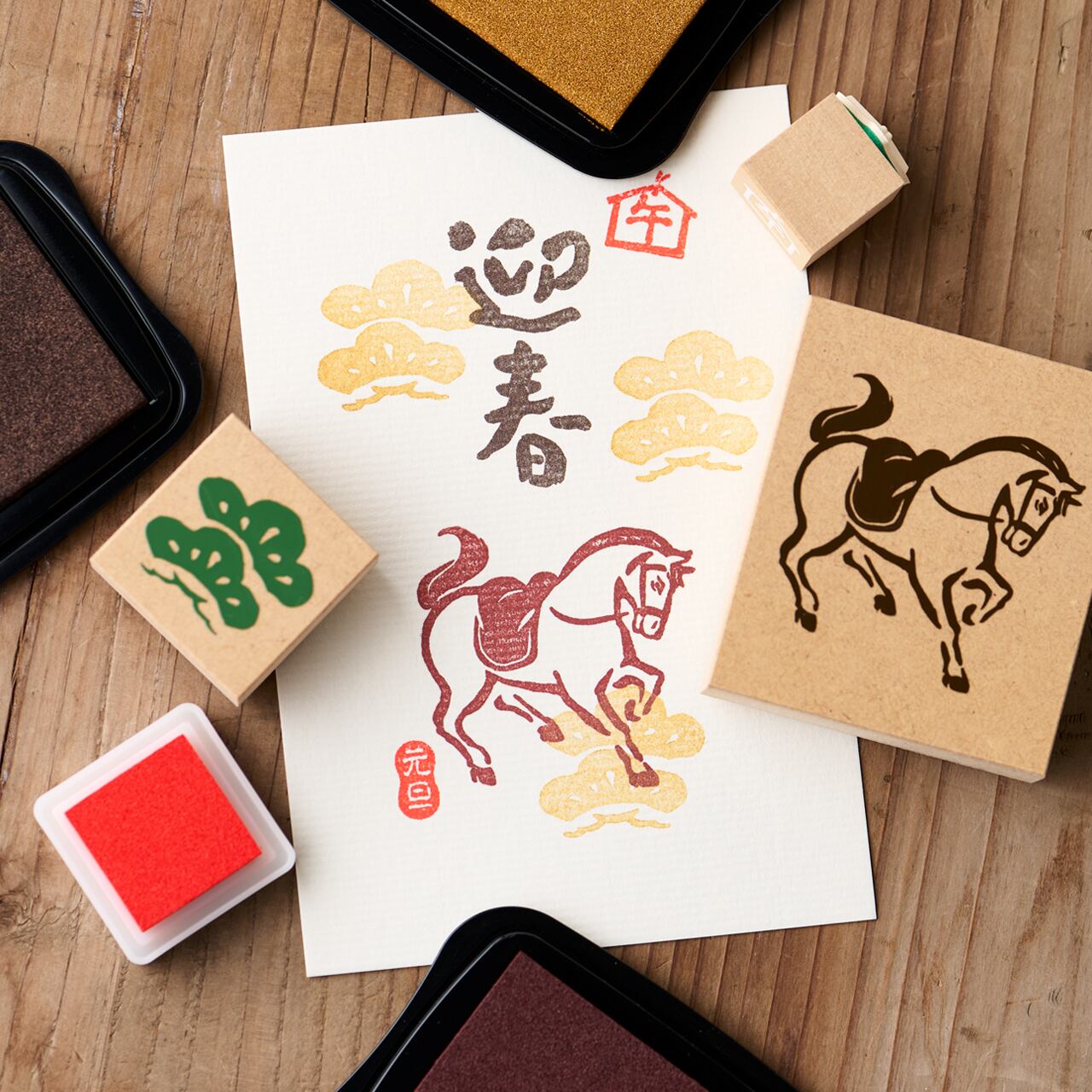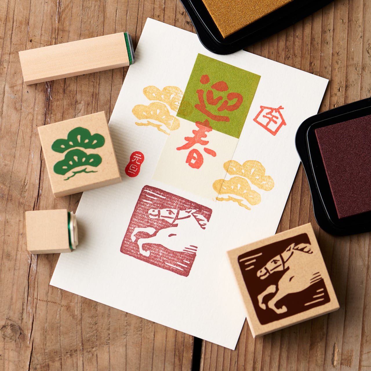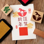 ます紙と組み合わせる場合、ます紙の上からスタンプを捺すだけでなく、スタンプを捺してから印影の一部を隠すようにます紙を貼ると、また違った表現になります。